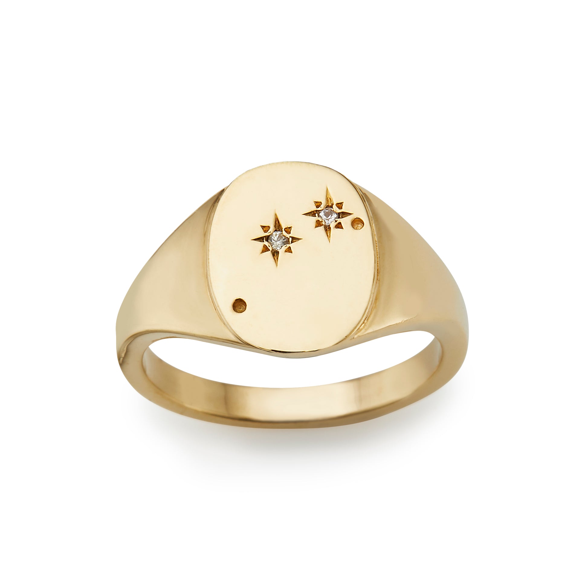 Our Signet Ring has a design update, to be that little bit more personal.  We celebrate our Aries babes with her zodiac constellation, set with white topaz and engraved stars.
