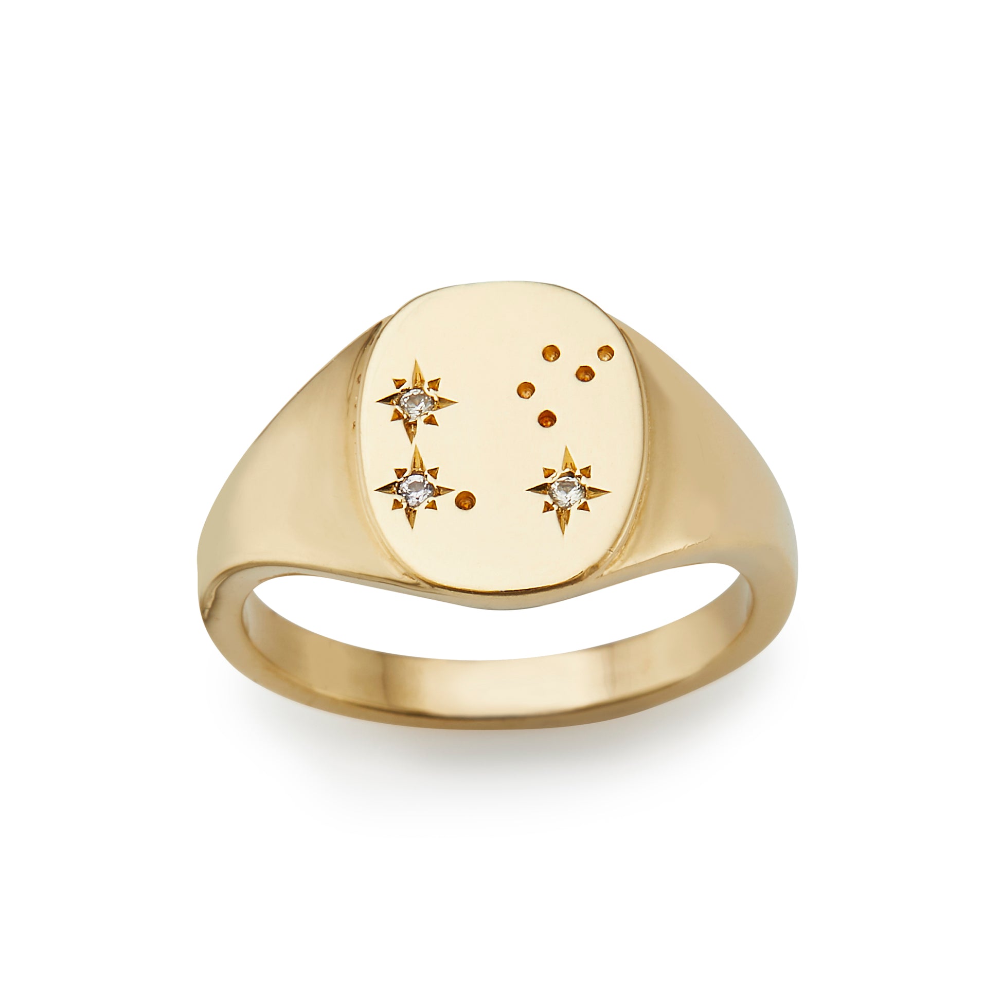 Our Signet Ring has a design update, to be that little bit more personal. We celebrate our Leo babes with her zodiac constellation, set with white topaz and engraved stars.