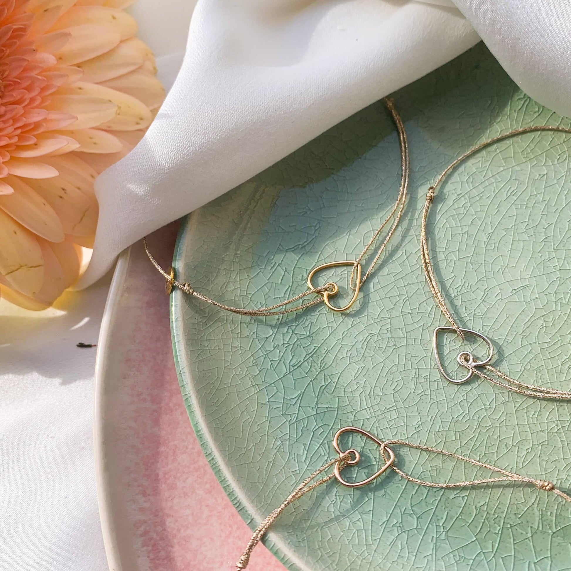 A fine 10mm heart charm, available in gold-plated (3 microns), set on a soft lurex thread. Adjustable with one or two sliding knots for the perfect fit.